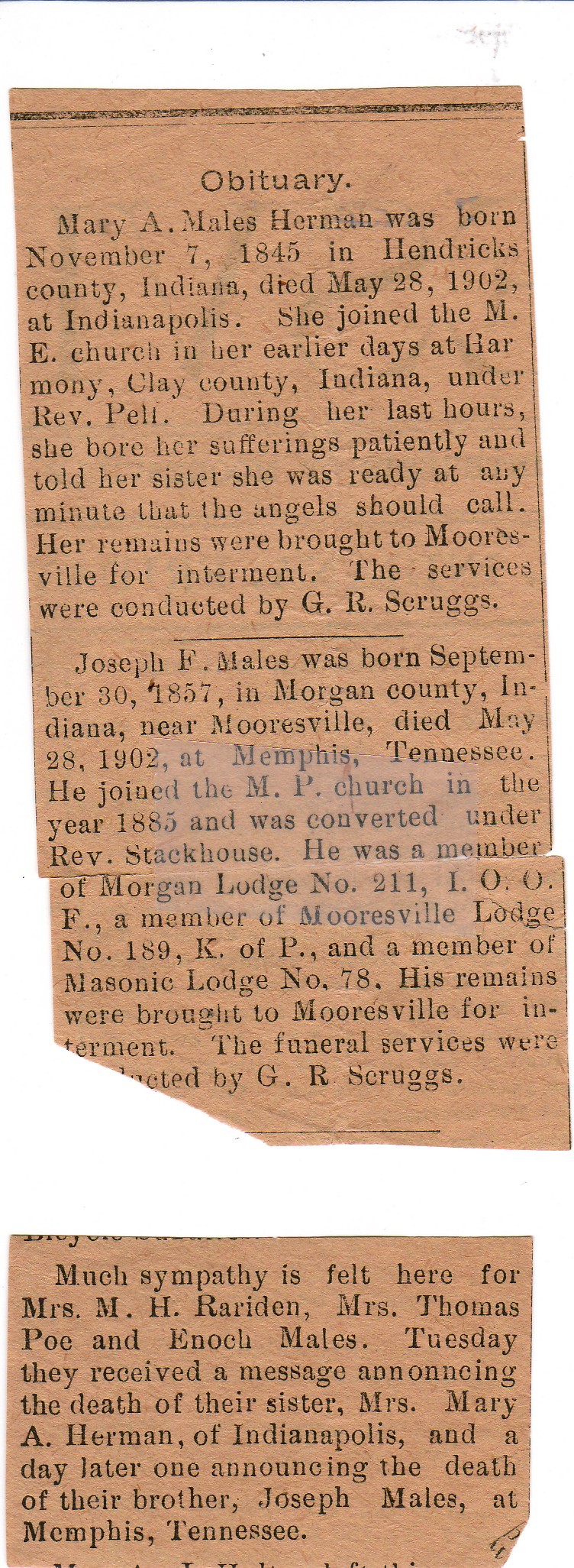 Other Age 44. Born near Mooresville, Ind. Died Memphis, Tennessee. Buried Mooresville Cemetery. Sister, Mrs. Mary A. Herman of Indianapolis, died on the same day as Joseph. Member of Masons, K. of P., and I.O.O.F. Member M.P. Church.