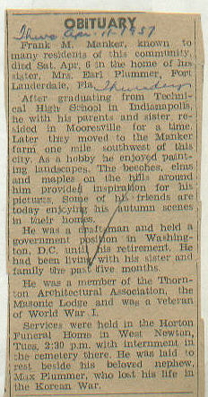 | Other | Age 61. Veteran of WW II: 28 Co. 159 Dep. Brig. Died at home of his sister, Mrs. Earl Plummer, Ft. Lauderdale, Fla. Horton Funeral Home, West Newton. Buried West Newton cemetery, beside beloved nephew Max Plummer, who was killed in Korean War. |