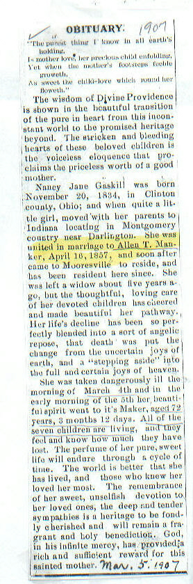 | Other | Age 72 years, 3 months, and 12 days. Buried in Manker family plot, Mooresville Cemetery. Died of a stroke. Born in Clinton Co., Ohio. |