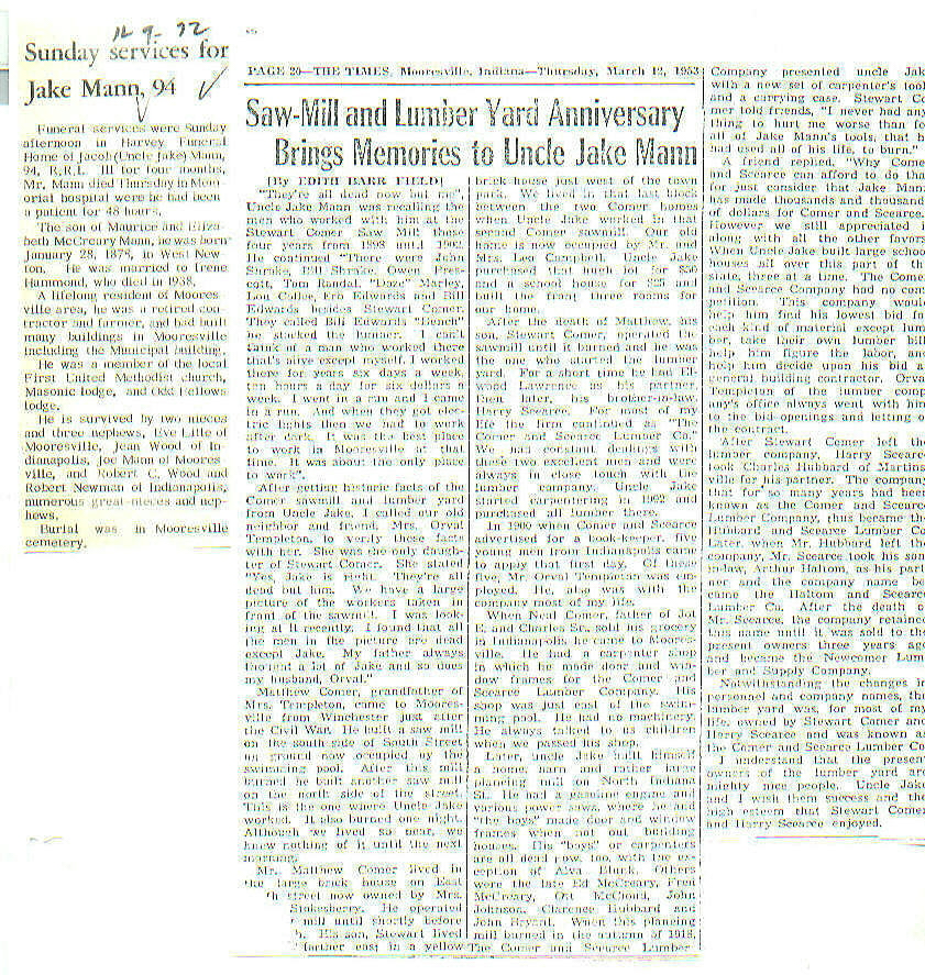 | Other | Age 94. Harvey Funeral. Buried Mooresville Cemetery. Parents: Maurice and Elizabeth McCreary Mann. Carpenter; built many home and business buildings in Mooresville. Died at Morgan Co. hospital. |