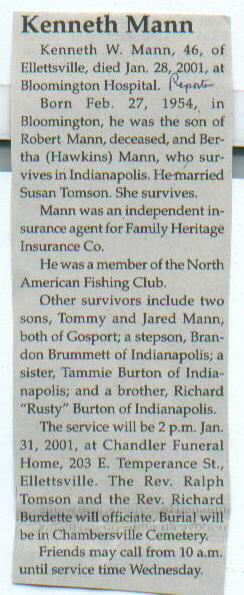 | Survived By | Spouse; mother, Bertha (Hawkins) Mann; sons, Tommy and Jared Mann; sister, Tammie Burton; brother, Richard Burton. |
