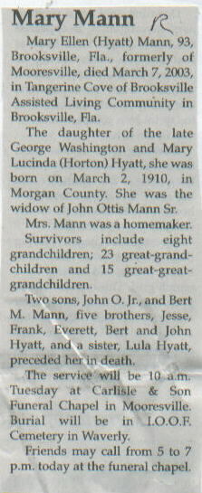 | Other | Preceded in death by two sons, John O., Jr. and Bert M. Mann; five brothers, Jesse, Frank, Everett, Bert, and John Hyatt; and a sister, Lula Hyatt. |
