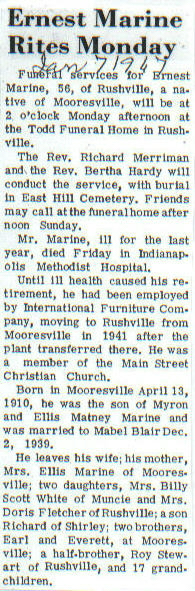 | Survived By | Wife; mother, Ellis Matney Marine; daughters, Mrs. Billy Scott White and Mrs. Doris Fletcher; son, Richard Marine; brothers, Earl and Everett Marine; half-brother, Roy Stewart. |