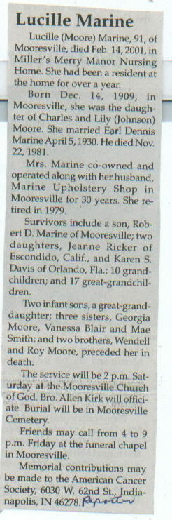| Other | Age 91. Preceded in death by spouse; parents, Charles and Lily (Johnson) Moore; brothers, Wendell and Roy Moore; sisters, Georgia Moore, Vanessa Blair, and Mae Smith; 2 infant sons; one great-granddaughter. |