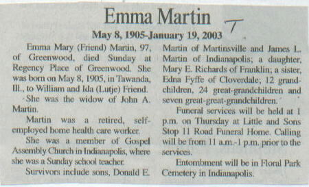 Survived By Sons, Donald E. and James L. Martin; daughter, Mary E. Richards; sister, Edna Fyffe; 12 grandchildren; 24 great-grandchildren; 7 great-great-grandchildren.