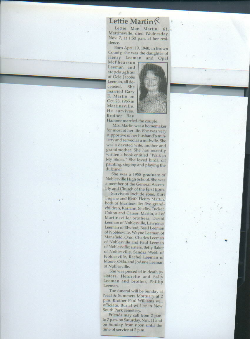 | Survived By | Spouse; sons, Kurt Eugene and Keith Henry Martin; brothers, David, Lawrence, Basil, Wayne, Charles, and Paul Leeman; sisters, Betty Baker, Sandra Webb, Rachel Leeman, and JoAnne Leeman; 5 grandchildren. |