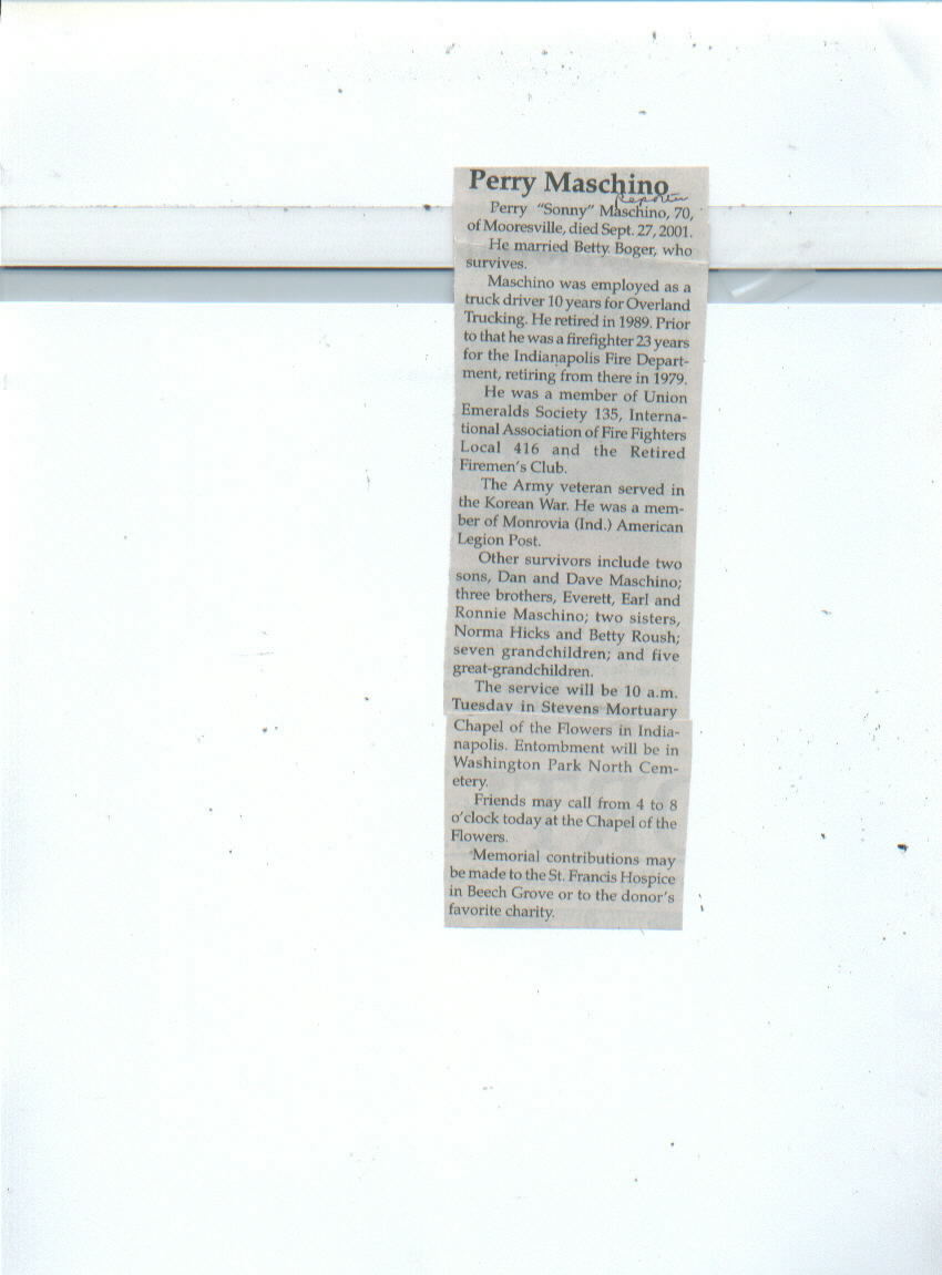 | Survived By | Spouse; sons, Dan and Dave Maschino; brothers, Everett, Earl, and Ronnie Maschino; sisters, Norma Hicks and Betty Roush; 7 grandchildren; 5 great-grandchildren. |