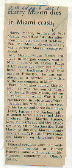 | Survived By | Wife; father, Virgil Mason; daughters, Janet, Patricia, and Darlene Mason; sisters, Mrs. Martha Pauley, Mrs. Mary Cherry, and Mrs. Dorothy Lane; brothers, Paul, Floyd, and Maurice Mason. |