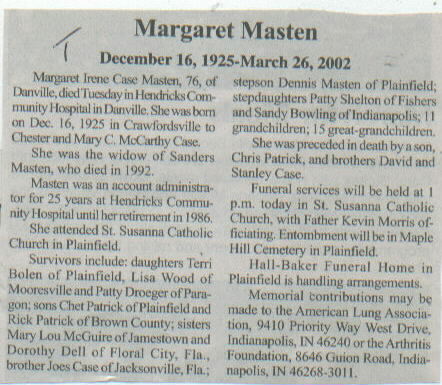 Survived By Daughters, Terri Bolen, Lisa Wood, and Patty Droeger; sons, Chet and Rick Patrick; sisters, Mary Lou McGuire and Dorothy Dell; brother, Joes Case; stepson, Dennis Masten; stepdaughters, Patty Shelton and Sandy Bowling; 11 grandchildren; 15 great-grandchildren.