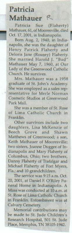 Survived By Spouse; daughters, Lisa McKenzie and Shawn Matthews; son, Keith Mathauer; sisters, Joanne Dugger and Mary Flaherty; brothers, Danny and Michael Flaherty; 10 grandchildren.
