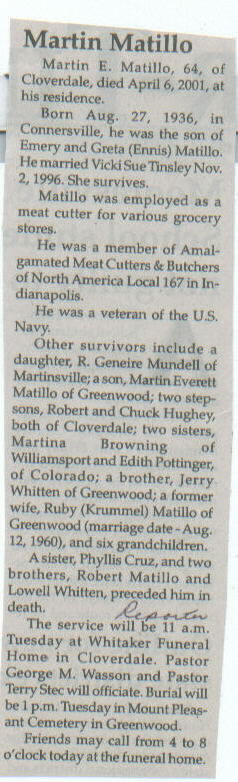 | Survived By | Spouse; daughter, R. Geneire Mundell; son, Martin Everett Matillo; sisters, Martina Browning and Edith Pottinger; brother, Jerry Whitten; former wife, Ruby (Krummel) Matillo; 6 grandchildren. |