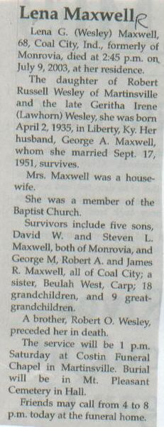 | Survived By | Spouse; 5 sons, David W., Steven L., George M., Robert A., and James R. Maxwell; sister, Beulah West; 18 grandchildren; 9 great-grandchildren. |
