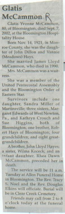| Other | Preceded in death by a brother, John Lloyd Hayes; a sister, Wilma Koceck; and an infant daughter, Rhea Dawn McCammon. |