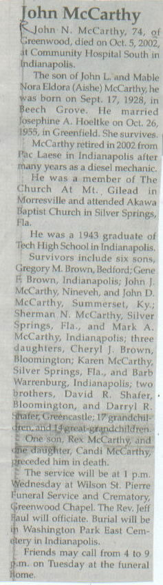 | Survived By | Widow; 6 sons, Gregory M. and Gene F. Brown, John J., John D., Sherman N., and Mark A. McCarthy; 3 daughters, Cheryl J. Brown, Karen McCarthy, and Barb Warrenburg; 2 brothers, David R. and Darryl R. Shafer; 17 grandchildren; 14 great-grandchildren. |