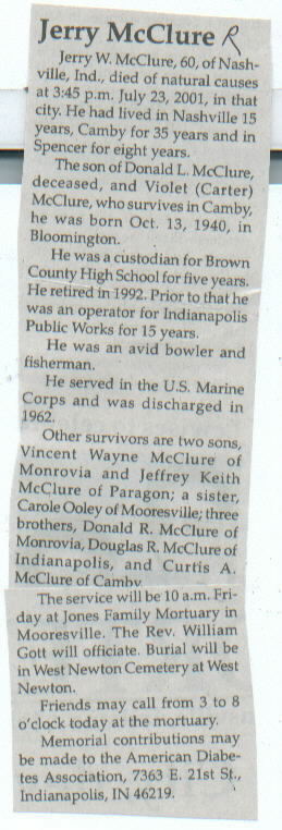 Survived By Mother, Violet (Carter) McClure; sons, Vincent Wayne and Jeffrey Keith McClure; sister, Carole Ooley; brothers, Donald R., Douglas R., and Curtis A. McClure.