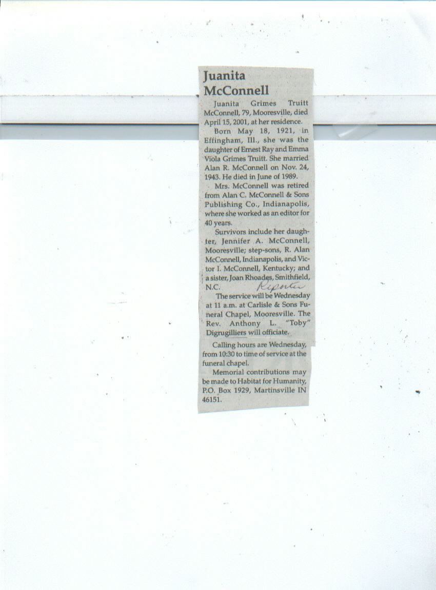| Survived By | Daughter, Jennifer A. McConnell; stepsons, R. Alan and Victor I. McConnell; sister, Joan Rhoades. |