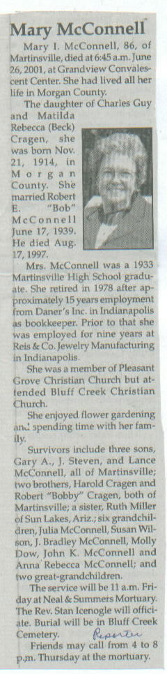 | Survived By | Sons, Gary A., J. Steven, and Lance McConnell; brothers, Harold and Robert Cragen; sister, Ruth Miller; 6 grandchildren; 2 great-grandchildren. |