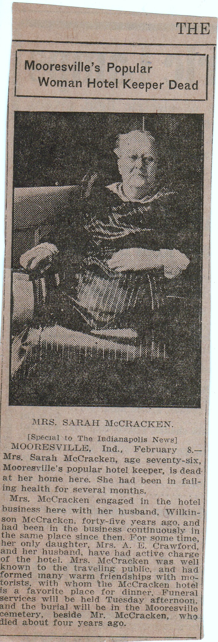 | Other | Age 75. Married James W. McCracken on Oct. 25, 1857. Together they ran the McCracken House, a popular restaurant and hotel in Mooresville, for 45 years. Then their daughter and her husband took over the running of the establishment. |