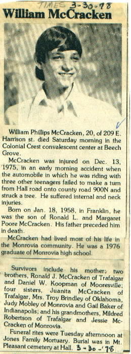 | Survived By | Mother, Margaret Poore McCracken; brothers, Ronald J. McCracken and Daniel W. Koopman; sisters, Juanita McCracken, Mrs. Troy Grindley, Judy Mobley, and Gail Baker. |