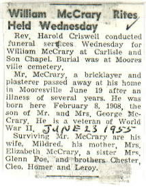 | Survived By | Wife, Mildred; mother, Mrs. Elizabeth McCrary; sister, Mrs. Glenn Poe; brothers, Chester, Cleo, Homer, and Leroy McCrary. |