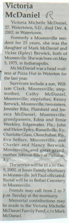 | Survived By | Parents, Mark McDaniel and Vickie (Epley) Berwick; son, William Clark; stepmother, Cathy McDaniel; stepfather, Kenny Berwick; 2 sisters, Jennifer Rike and Jessica McDaniel; grandparents, Edna and Ernie Weekley, John and Helen Epley, Charlotte Glass, Eva Sellars, and Charles and Nancy Berwick; great-grandmother, Johnnie Riley. |