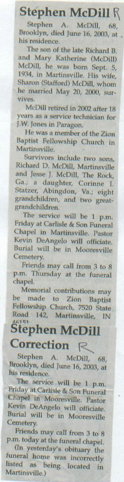 | Survived By | Widow; 2 sons, Richard D. and Jesse J. McDill; daughter, Corinne I. Statzer; 8 grandchildren; 2 great-grandchildren. |