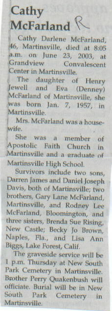| Survived By | Two sons, Darren James and Daniel Joseph Davis; 2 brothers, Gary Lane McFarland and Rodney Lee McFarland; 3 sisters, Brenda Sue Rising, Becky Jo Brown, and Lisa Ann Biggs. |