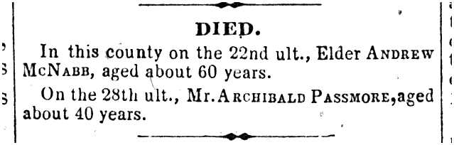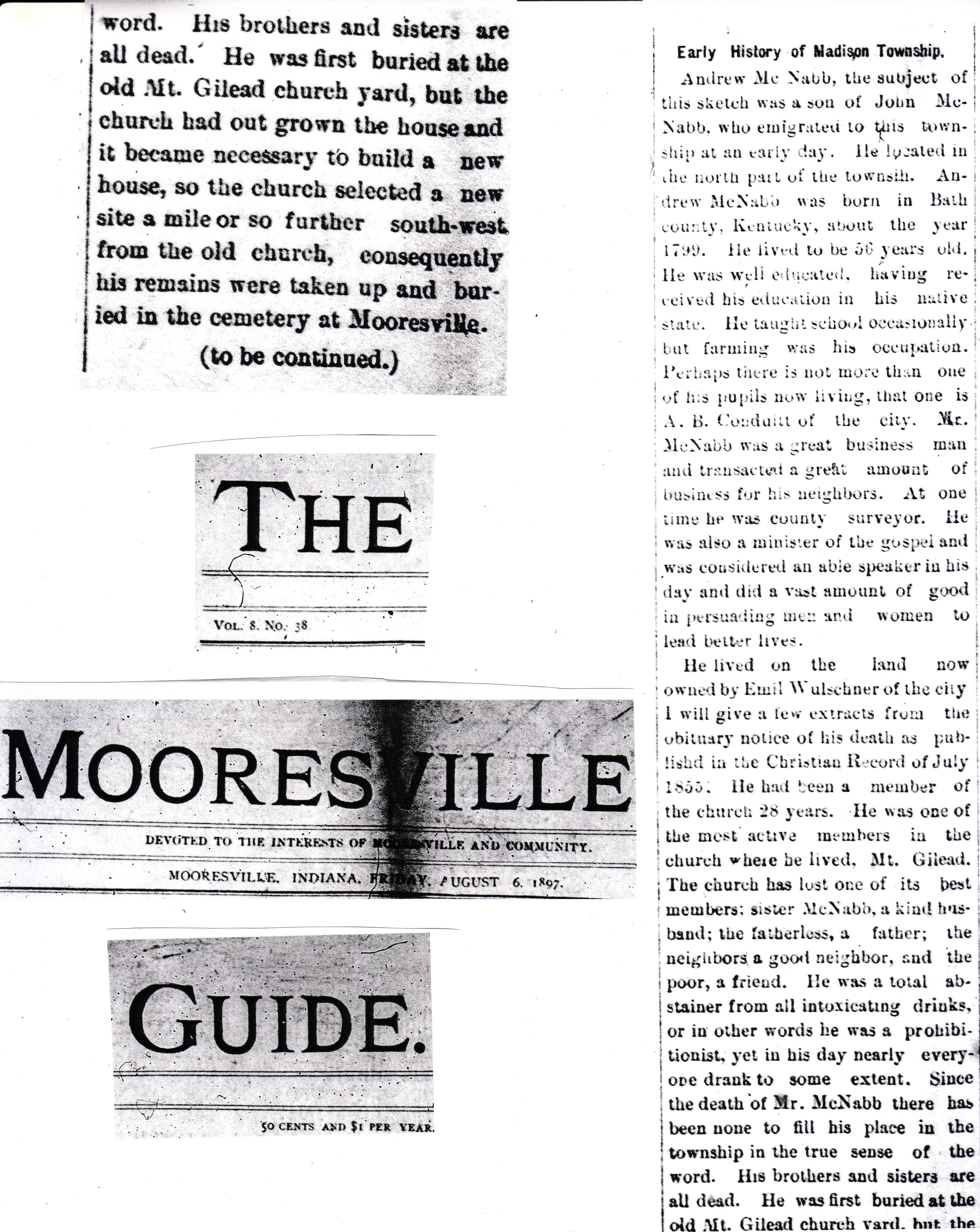 | Other | Age 58 years, 9 months, and 7 days. Born in Bath Co., Kentucky on Sept. 6, 1795; son of John and Martha Hicklin McNabb. Was an early settler of Madison Twp., Morgan Co., Ind. Died of congestive fever. He was buried at Mt. Gilead Church but later was moved to Mooresville when the church was torn down. [Source: article on Madison Township history in the Mooresville Guide for Aug. 6, 1897.] Father of one son, Andrew Jackson McNabb, from his first marriage, and 5 children from his second marriage. |
