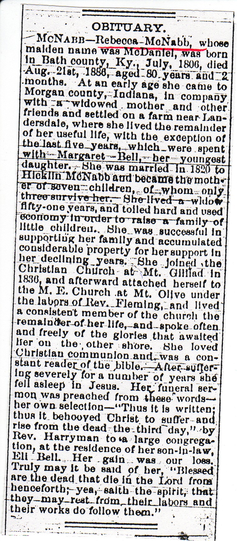 | Other | Age 80 years and 2 months. Born in Bath Co., Ky. Parents: Henry and Sarah (Hicklin) McDonald. "At an early age, she came to Morgan County, in company with a widowed mother and other friends and settled on a farm near Landersdale, where she spent all of her life except for the last 5 years, when she lived with her youngest daughter, Mrs. Margaret Bell." Mother of seven children; had been a widow for 51 years. |