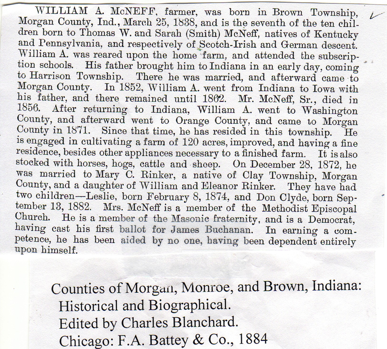 Other Age 69. Born in Brown Twp., Morgan Co., Ind. Parents: Thomas W. and Sarah (Smith) McNeff. Married on Dec. 28, 1872; father of 2 children: Leslie and Don Clyde.