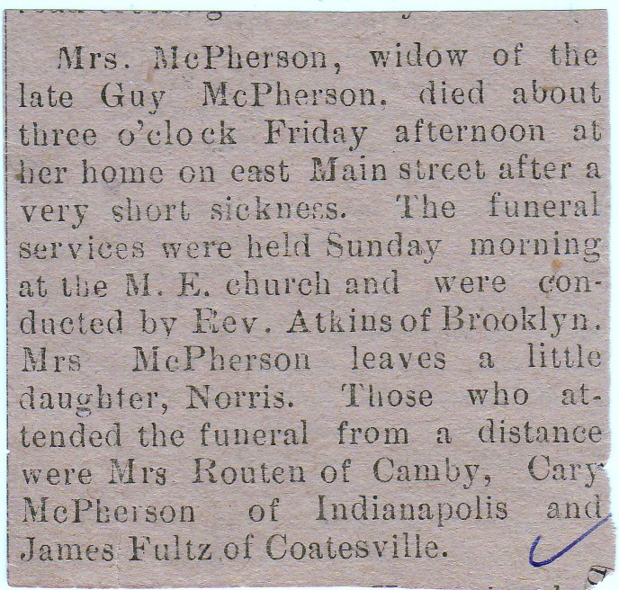 | Other | Age 35. "...widow of the late Guy McPherson, died about three o'clock Friday afternoon at her home on east Main street after a very short sickness. The funeral services were held Sunday morning at the M.E. church and were conducted by Rev. Atkins of Brooklyn." Born in Mooresville. Parents: Henry and Sarah House. Buried in McPherson family plot, Mooresville Cemetery. |