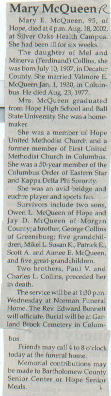 | Survived By | Two sons, Owen L. and Jay D. McQueen; brother, George Collins; 5 grandchildren, Mikel L., Susan K., Patrick E., Scott A., and Aimee E. McQueen; 5 great-grandchildren. |