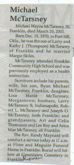 Survived By Spouse; parents, Larry and Kathy J. (Thompson) McTarsney; son, Ryan Michael McTarsney; daughter, Lisa Marie McTarsney; brothers, Larry McTarsney II, Robert L., and Joseph O. McTarsney; grandparents.