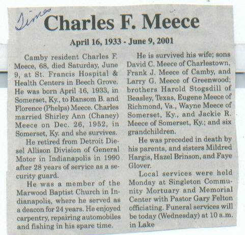 | Other | Preceded in death by parents, Ransom B. and Florence (Phelps) Meece; sisters, Mildred Hargis, Hazel Brinson, and Faye Glover. |