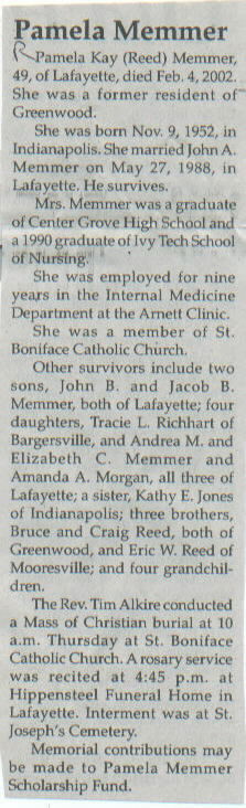 | Survived By | Spouse; 2 sons, John B. and Jacob B. Memmer; 4 daughters, Tracie L. Richhart, Andrea M. and Elizabeth C. Memmer, and Amanda A. Morgan; sister, Kathy E. Jones; 3 brothers, Bruce, Craig, and Eric W. Reed; 4 grandchildren. |
