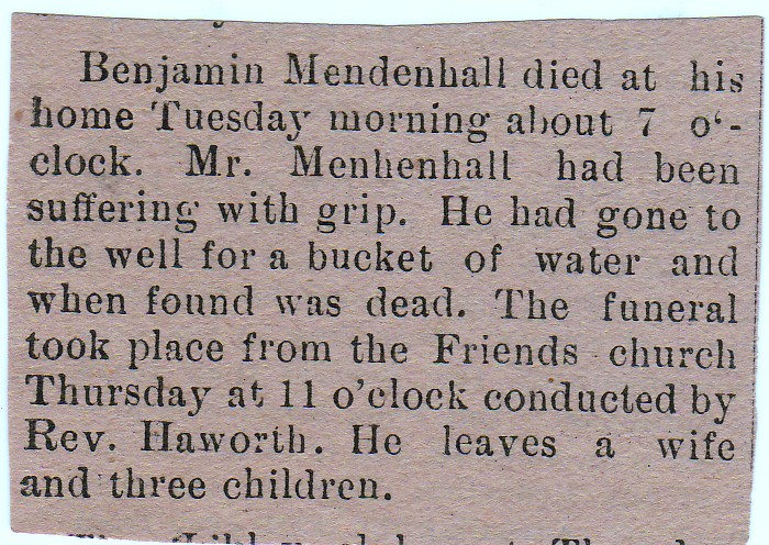 Other Age 72. Son of [Sarah Ballard Mendenhall and] Ira Mendenhall, who was born in Green County, Ohio and came to Morgan County, Ind. in 1826. Born in Brown Twp., Morgan Co. Married Sally Beeson on Feb. 28, 1846. Died of pneumonia. "He married Sallie Beeson in 1848 and to them were born 2 sons and a daughter. His wife died in 1884, and in 1894, he married Elma Dewees, who survives him."