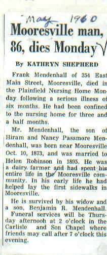 | Other | Age 86. Carlisle Chapel (Rev. Ralph Wade.) Buried Mooresville Cemetery. Parents: Hiram and Nancy Passmore Mendenhall. |