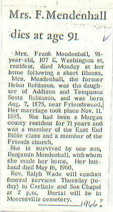 | Other | Age 91. Carlisle Funeral home (Rev. Ralph Wade). Buried Mooresville Cemetery. Parents: Addison and Tempanna Soots Robinson. Member Friends Church and East End Bible Class. Died at Plainfield Nursing Home; born near Friendswood, Ind. |
