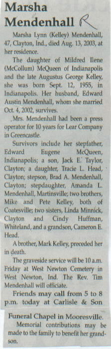 Survived By Mother, Mildred Ilene (McCollum) McQueen; husband; stepfather, Edward Eugene McQueen; son, Jack E. Taylor; daughter, Tracie L. Head; stepson, Brad A. Mendenhall; stepdaughter, Amanda L. Mendenhall; 2 brothers, Mike and Pete Kelley; 2 sisters, Linda Minnick and Cindy Huffman; grandson, Cameron E. Head.