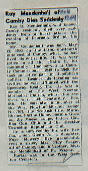 | Survived By | Widow; son, Glenn A. Mendenhall; daughter, Faye (Mrs. Leroy) Mowery; 5 grandchildren; sister, Mrs. Floy Yeager, all of Camby; and a brother, Murray Mendenhall of Ft. Wayne. |