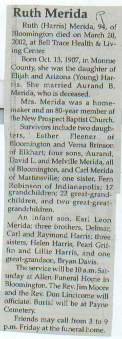 | Survived By | Two daughters, Esther Fleener and Verna Brinson; 4 sons, Aurand, David L., Melville, and Carl Merida; sister, Fern Robinson; 17 grandchildren; 23 great-grandchildren; 2 great-great-grandchildren. |