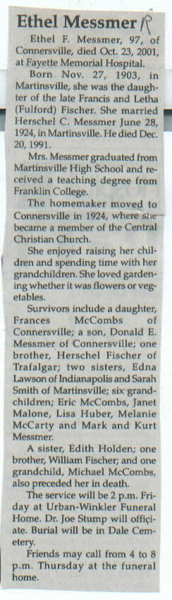Survived By Daughter, Frances McCombs; son, Donald E. Messmer; brother, Herschel Fischer; sisters, Edna Lawson and Sarah Smith; 6 grandchildren.