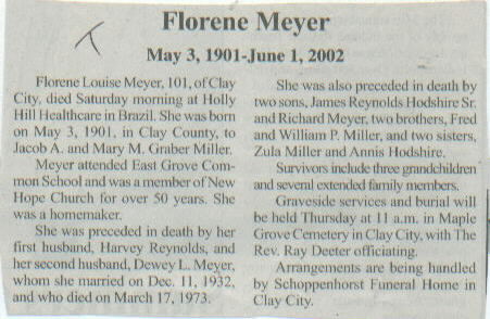 | Other | Preceded in death by both husbands; two sons, James Reynolds Hodshire, Sr. and Richard Meyer; two brothers, Fred and William P. Miller; and two sisters, Zula Miller and Annis Hodshire. |