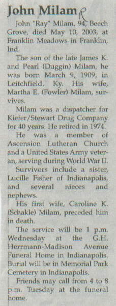| Other | His first wife, Caroline K. (Schakle) Milam, preceded him in death. United States Army veteran, WW II. |
