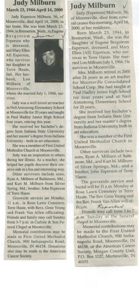 | Survived By | Husband; sons, Ryan and Kurt Milburn; brother, John Esperson of Terre Haute. |