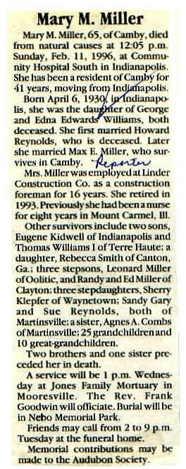 | Survived By | Husband; sons, Eugene Kidwell and Thomas Williams; daughter, Rebecca Smith; sister, Agnes Combs. |