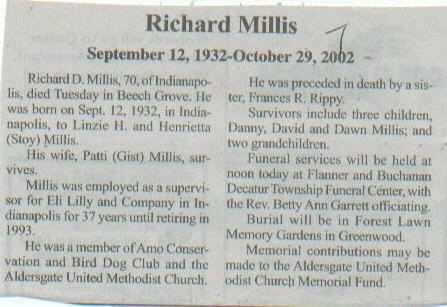 Survived By Widow; 3 children, Danny, David, and Dawn Millis; 2 grandchildren.