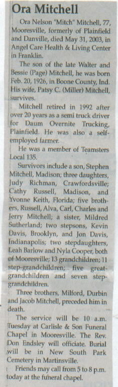 | Survived By | Widow; son, Stephen Mitchell; 3 daughters, Jucy Richman, Cathy Russell, and Yvonne Keith; 5 brothers, Russell, Alva, Carl, Charles, and Jerry Mitchell; sister, Mildred Sutherland; 2 stepsons, Kevin Davis and Jon Davis; 2 stepdaughters, Leah Barlow and Nyla Cooper; 13 grandchildren; 11 step-grandchildren; 5 great-grandchildren; 7 stepgreat-grandchildren. |
