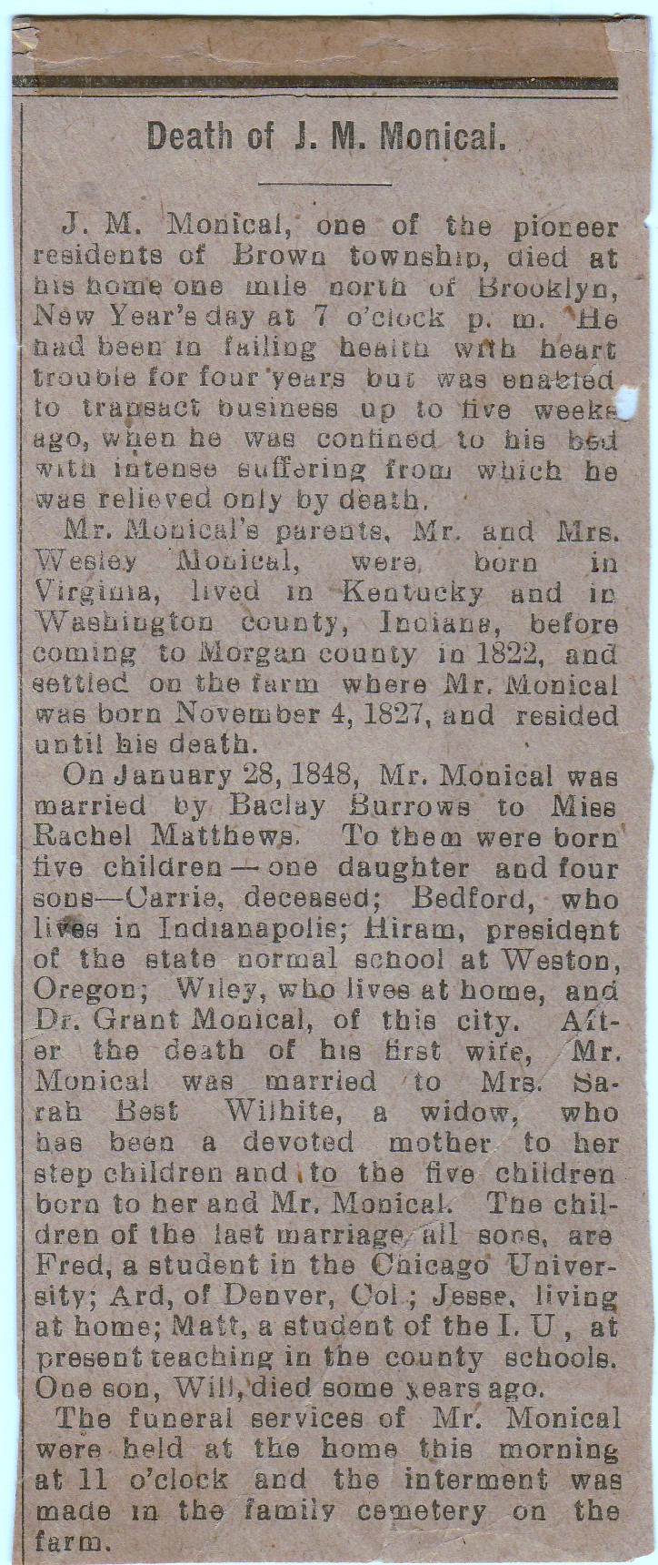 | Other | Age 73. Son of Wesley and Katherine Ard Monical. Married first wife on Jan. 28, 1848; they had 5 children together: Carrie, Bedford, Hiram, Wiley, and Grant. After Rachel's death, he married again, on Oct. 30, 1861. Father of 5 more children: Fred, Thomas Ard, William B., Jesse, and Matt. He was Morgan County Assessor for a time. |