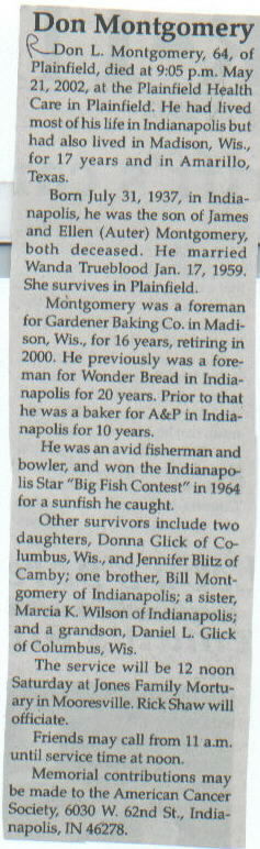 | Survived By | Widow; 2 daughters, Donna Glick and Jennifer Blitz; one brother, Bill Montgomery; sister, Marcia K. Wilson; grandson, Daniel L. Glick. |